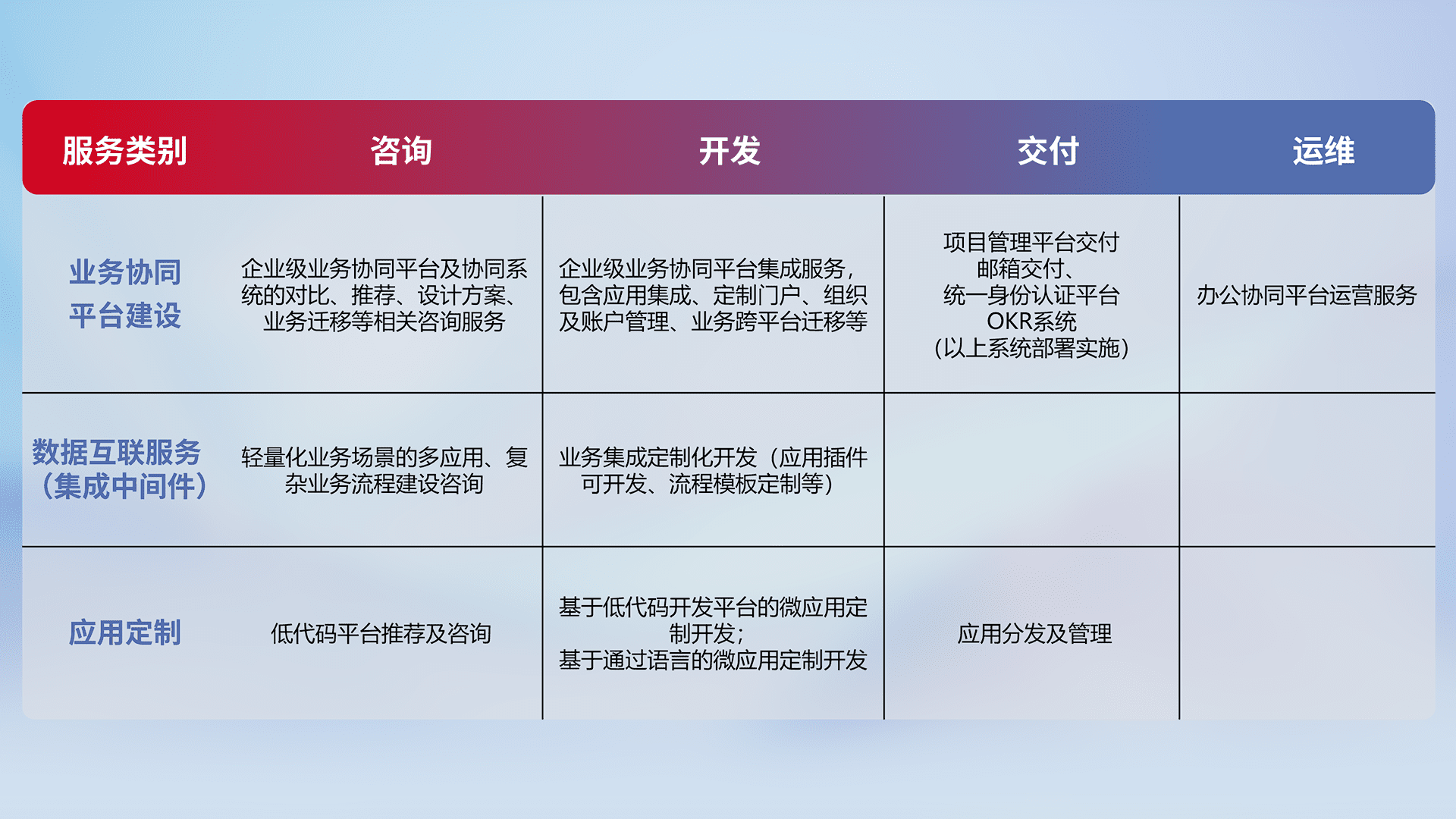 针对钉钉、、、、企微、、IDaas等平台级产品提供产品的规划、、、、方案、、、交付、、定制化开发等服务,,,,实现如统一协同办公、、智能客户服务、、、、混合会议管理、、、、智能数据查询、、等业务场景,,,实现数字化转型。。