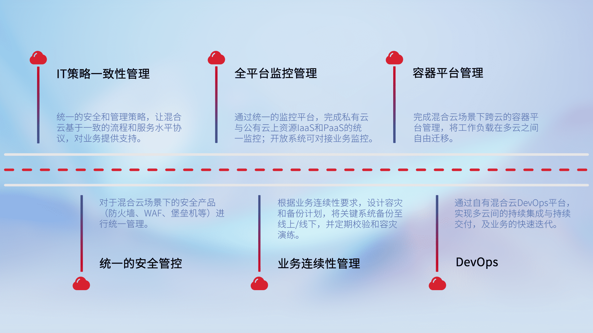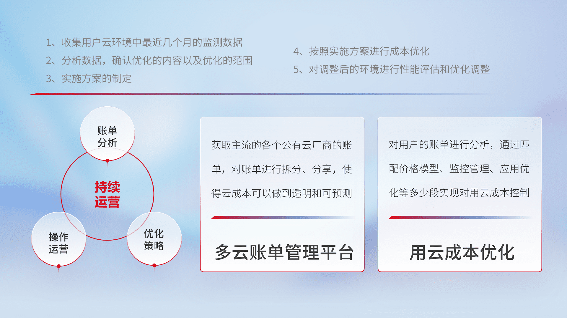 通过多云纳管,,,以统一的资源数据模型把客户的云资源进行抽象和封装,,,进而实现对多云资源的统一操作,,,,保障云资源管理的可靠性、、、、稳定性与可用性。。。量身定制化运维内容,,,配置、、、、开发运维、、、补丁管理、、、、备份、、监控、、、、认证和访问管理、、审计和日常巡检等,,,,保障在用云过程中的可靠度,,,稳定度以及高可用率。。。。