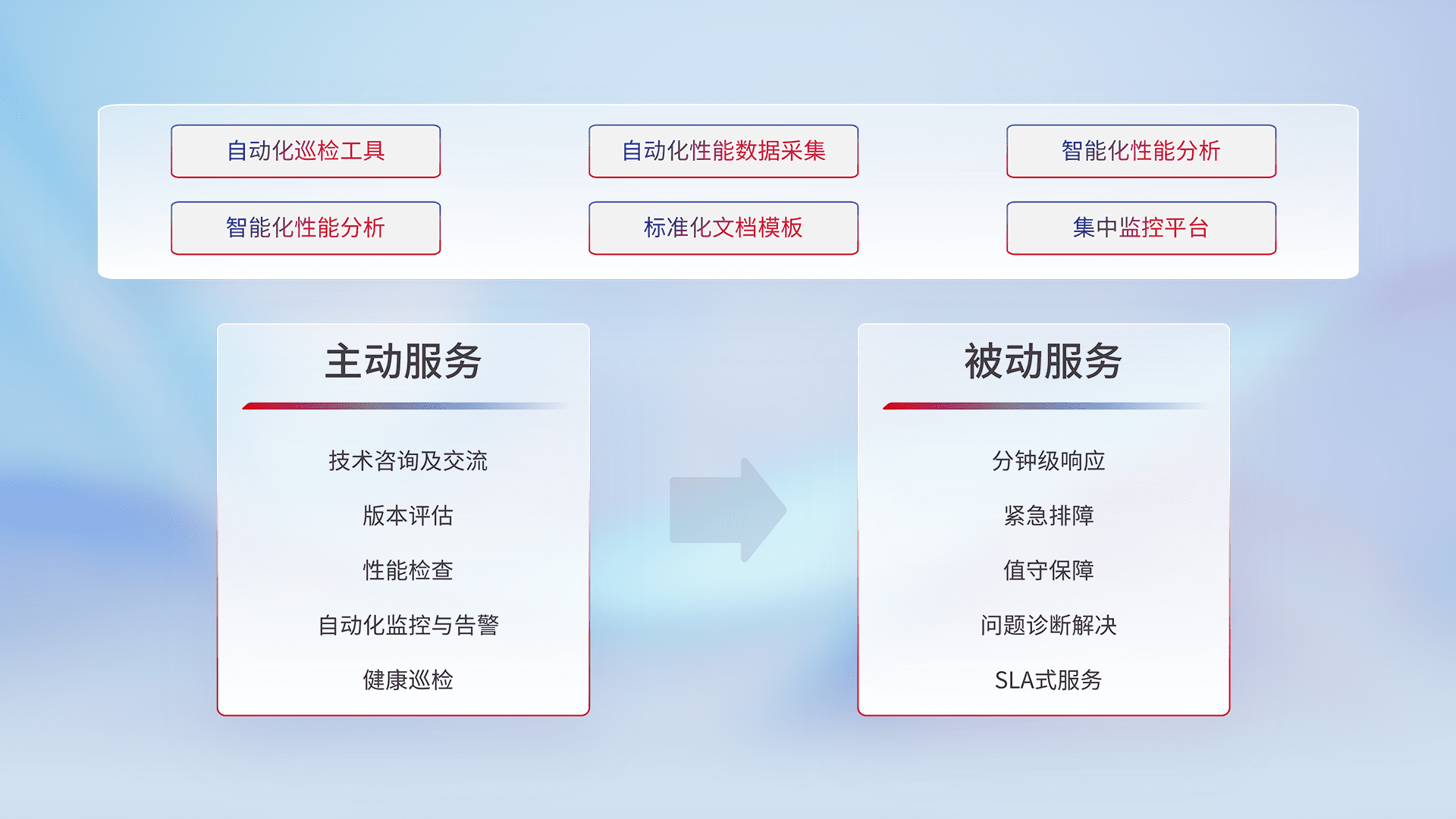 智能化工具和标准化文档,,保障服务质量,,提供主动服务(包含技术咨询、、、、版本评估、、、性能检查、、自动化监控与告警、、、健康巡检)和被动服务包含(分钟级响应、、紧急排障、、、、值守保障、、、问题诊断解决、、SLA服务)。。。